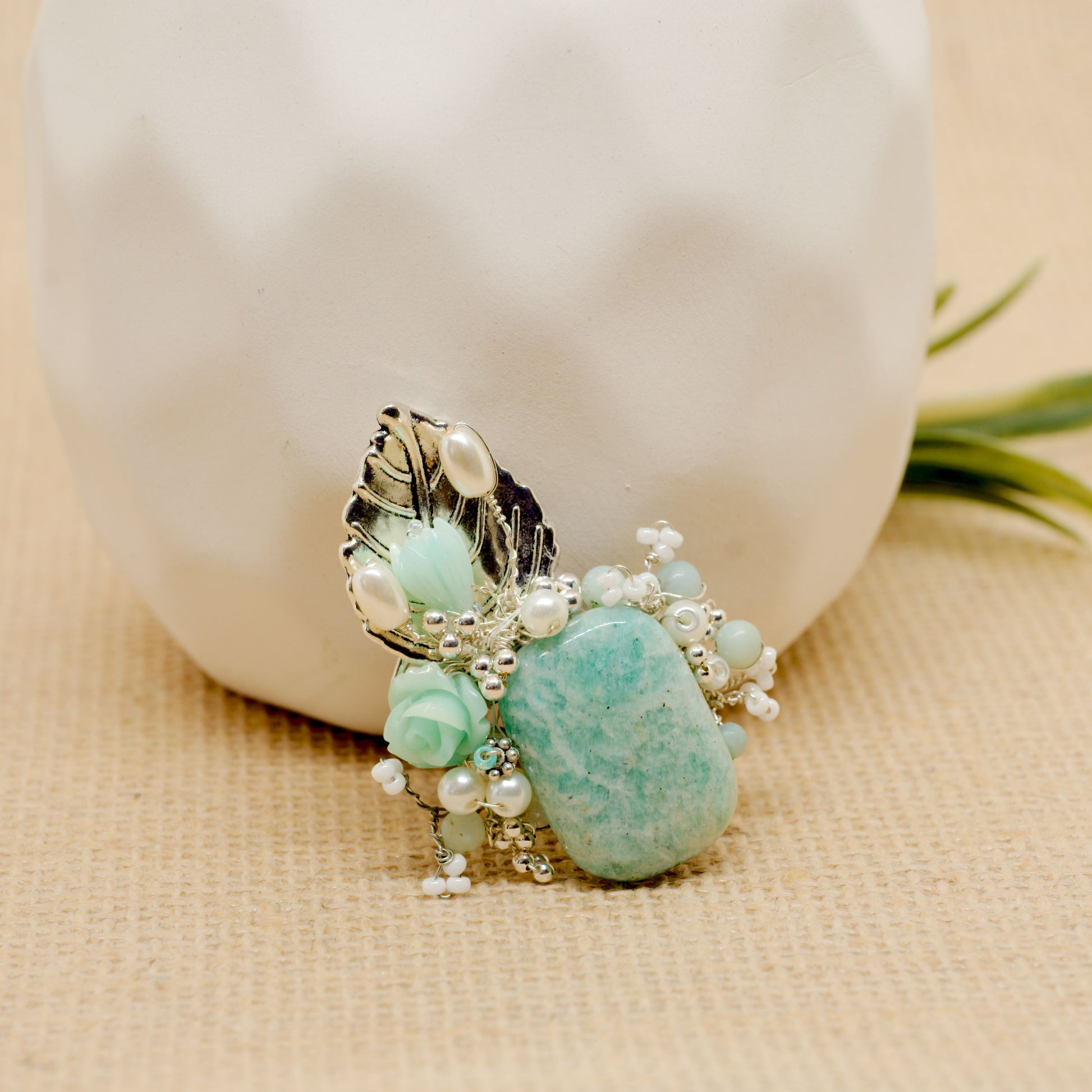 Set the tone and exude serenely confident energy when you wear the "Amazing Amazonite" brooch, a striking one-of-a-kind statement creation inspired by my experiences living on a boat in the Bahamas. Amazonite is a Chakra (energy) gemstone that is said to open someone to speaking one's truth with clarity and confidence, and empowering one to express authenticity without fear. The focal amazonite stone makes an impression with its mesmerizing blue and green tones and is harmoniously accented with delicate aqua and white flowers and a bold silver leaf. All elements are meticulously designed and placed for maximum impact.