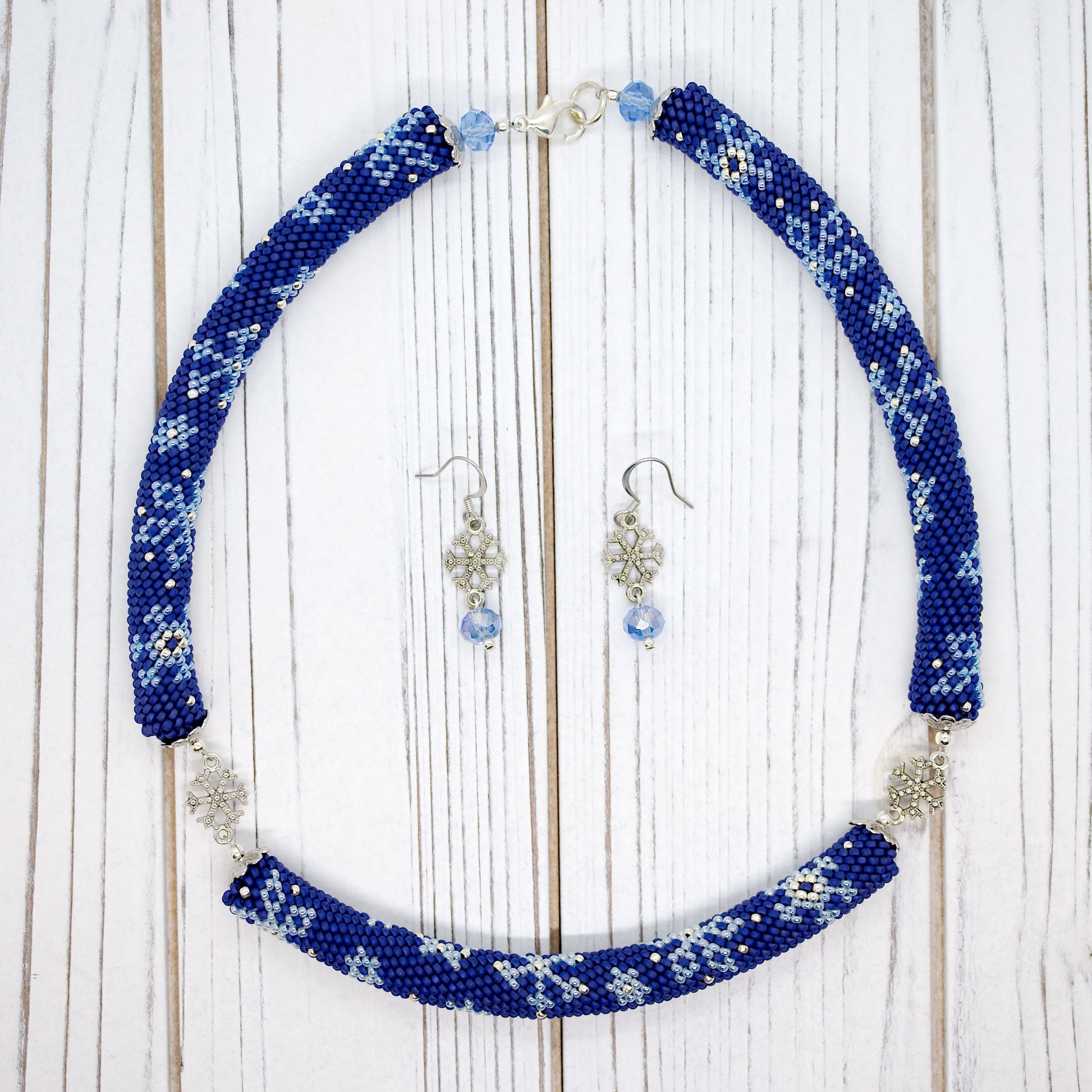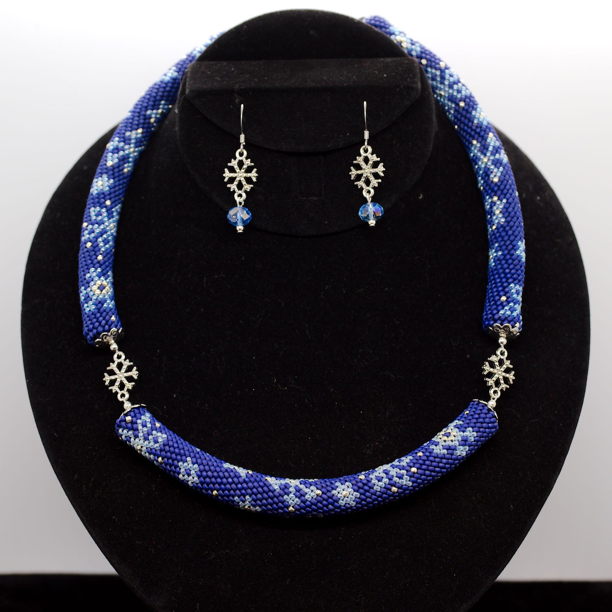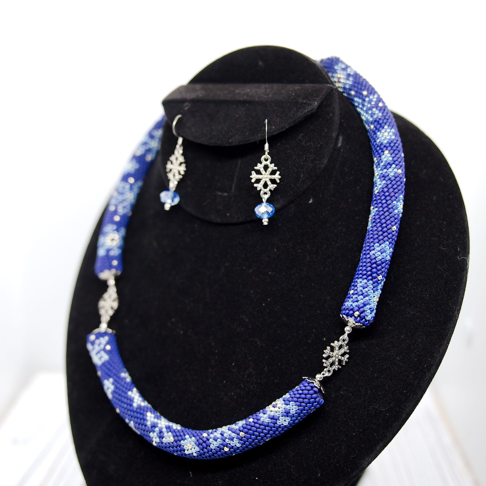 Embrace the enchanting beauty of a snowy night with the "Midnight Snow" bead crochet necklace and earrings set. All eyes will be on you when you wear this one-of-a-kind handcrafted ensemble that is perfect for the festive season or any winter occasion.