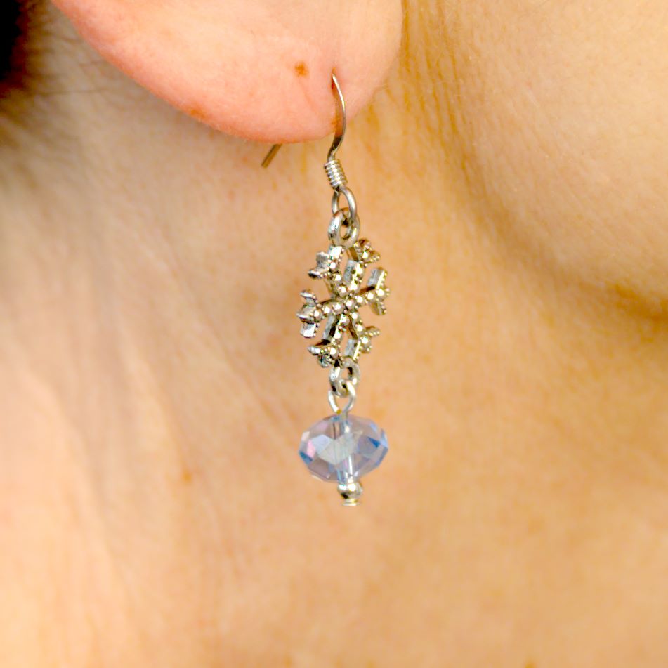 Lightweight and comfortable matching earrings feature delicate silver snowflake charms and light blue crystals that gracefully dangle, adding movement and sparkle to your look. The earrings complete the look and will make a statement on their own when worn separately.